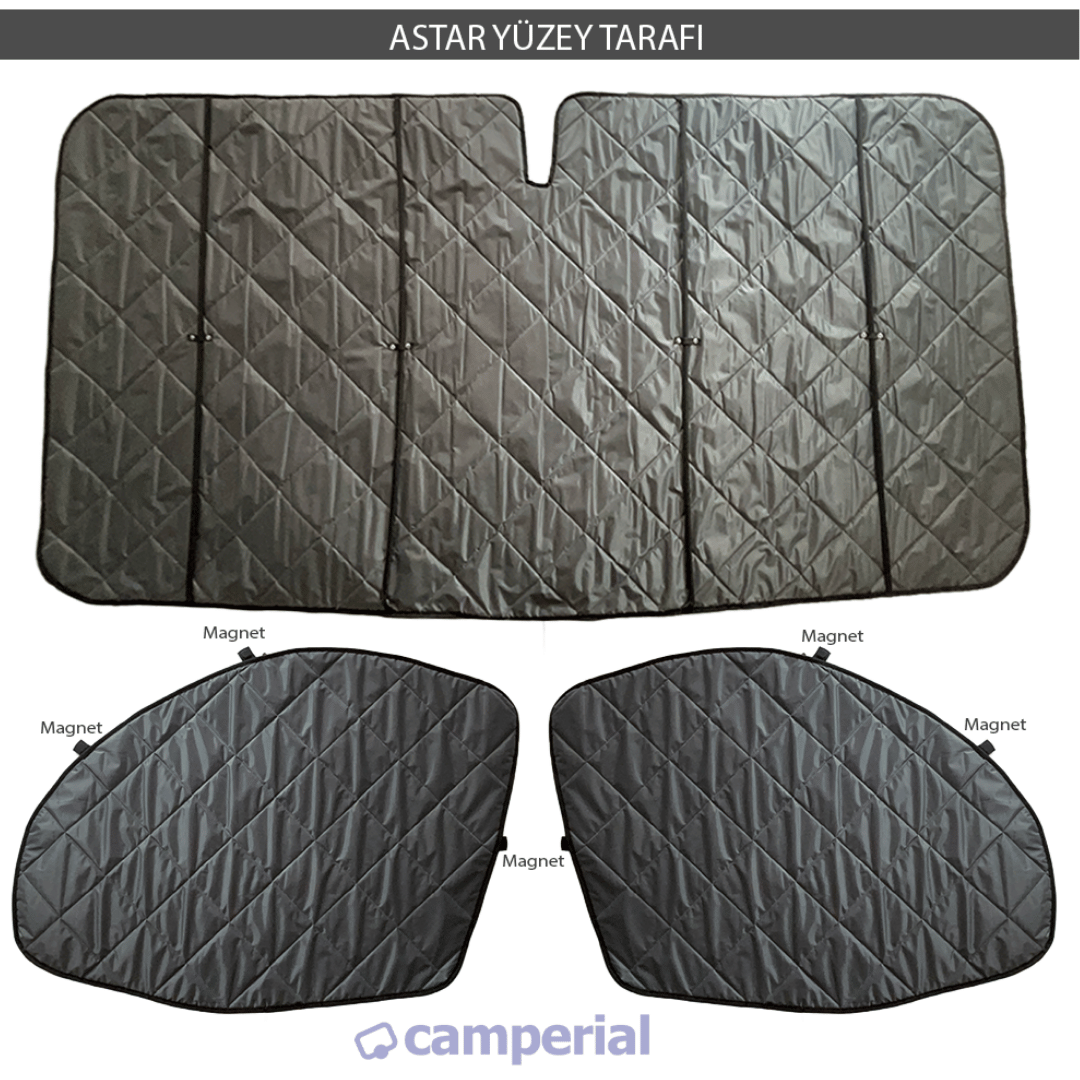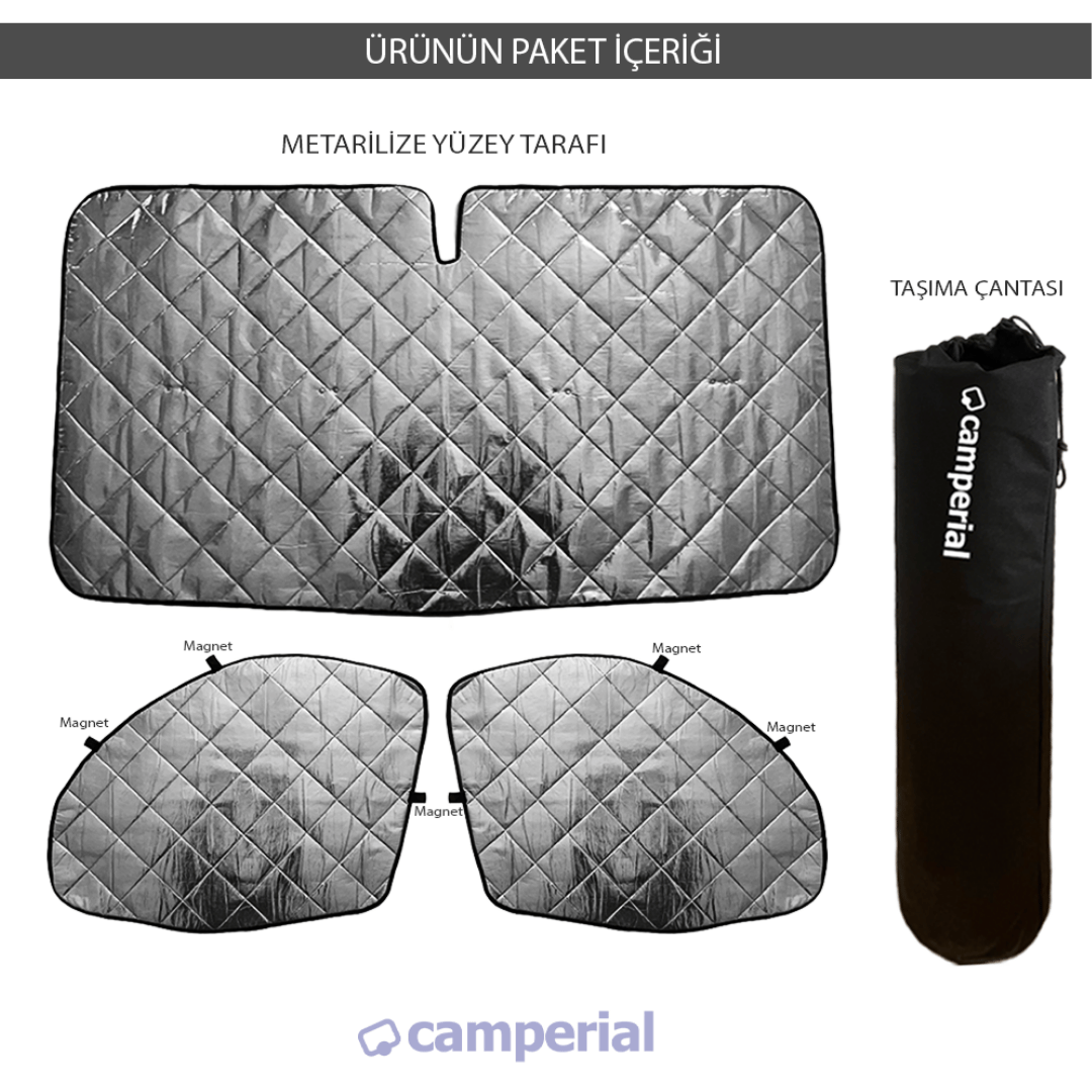 - 3 adet termal mat seti: 1 adet ön cam termal mat ve yan pencereler için 2 termal mat güneşlik teslim edilir.