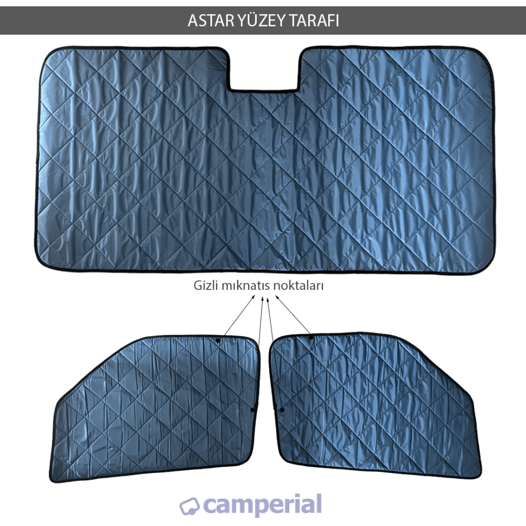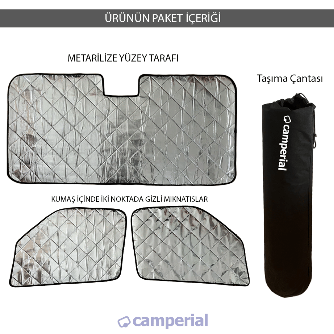 - 3 adet termal mat seti: 1 adet ön cam termal mat ve yan pencereler için 2 termal mat güneşlik teslim edilir.
