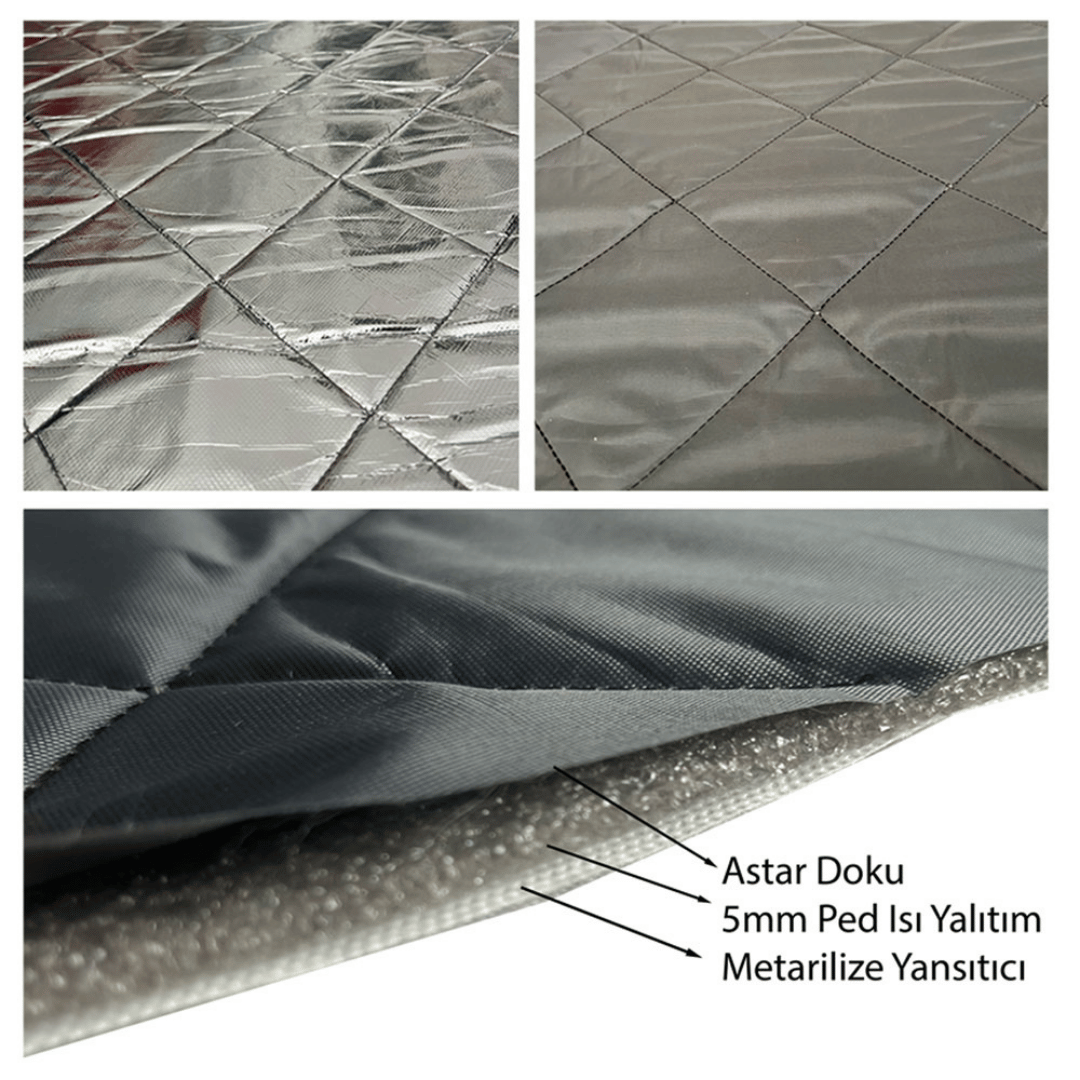 Yazın koruma: Yazın gümüş tarafı güneş ışığını yansıtmak ve aracınızı serin tutmak için dışarıya bakar kumaş içindeki termal ped sayesinde ısı yalıtımı gerçekleşir.